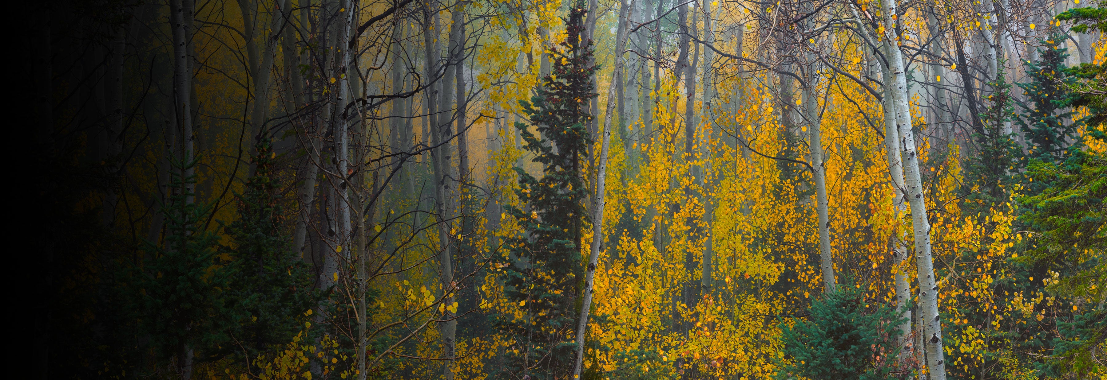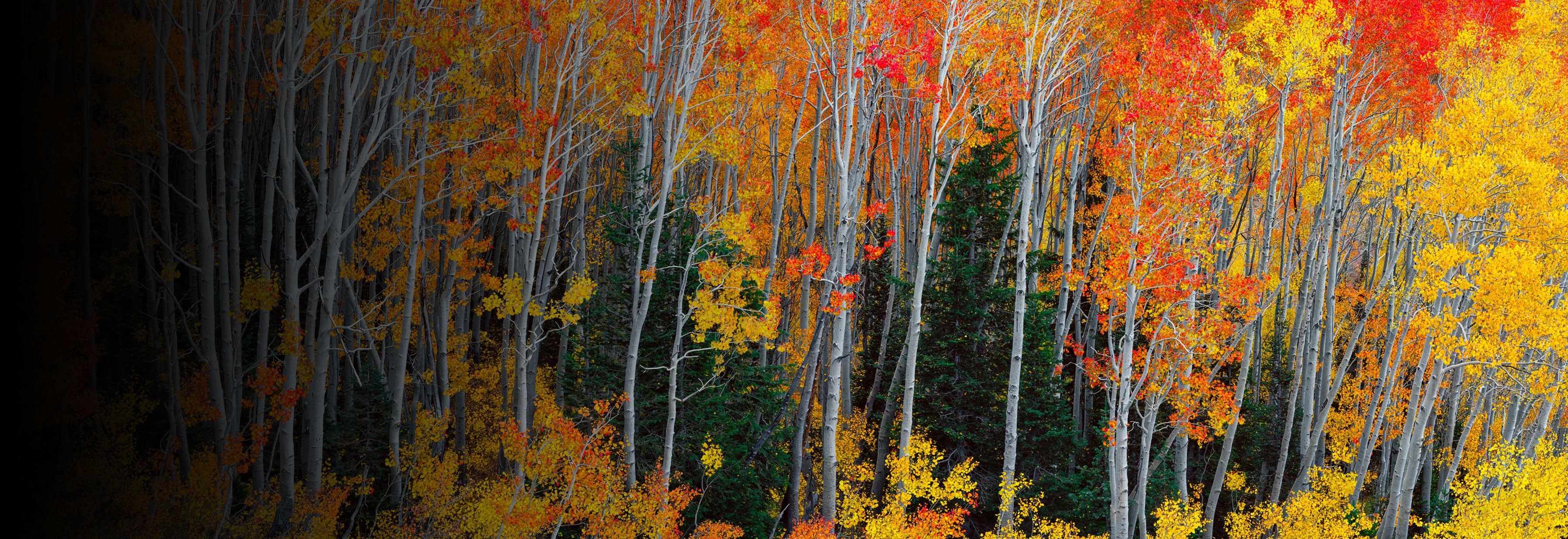 The moment this scene came together, the forest felt alive with quiet movement. Aspen trunks stood like silver sentinels, rising through a sea of fiery orange and deep green, each color marking the subtle shift between seasons.