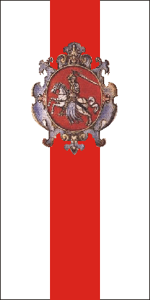 Those flags are interesting in my particular point of view, since they are all but tri-band, instead, the first image bears a transparent black-outlined shield charged by a black double-beamed cross -Lorraine cross- (surely that shield featured in the Pahonia -on the knight's shoulder-), the whole over the intersection of a "scandinavian" red cross on a white field; and the second image is also white with the red scandinavian cross, in the canton is the shield charged by the cross.