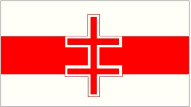 It is a white over red over white horizontal tricolour of unknown ratio. In the centre of the flag is a red-edged white lorraine cross with two equal horizontal crossbars. In the centre of the cross is another one of red color. The flag is probably a variant of the flag of the Belarus Popular-Front It was waved in a rally against President Lukashenko's victory of the last elections in Minsk. Source: Morgenmagazin, 20th March 2006, news on ARD(1st German TV)