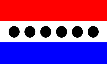 The flag of the UDP is horizontally divided red-white-blue with six black discs placed horizontally in the white stripe.