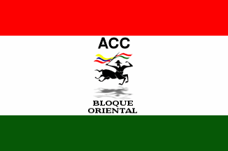 In image at the newspaper El Tiempo (The Time, eltiempo.terra.com.co;) taken in the late 90's or early 2000, it shows the flags proportion and also from top to bottom, the symbols displayed: 'ACC' lettering in black, a centaur waving a flag (or at least that's what it seems to me), a shadow of the centaur, and the words 'Bloque Oriental'. Another image has a description as the above, only to mention the colors of the flag, which are red (top), white (center) and green (bottom). The meaning of the colors is unknown to me. Official website at www.llanoadentro.com.