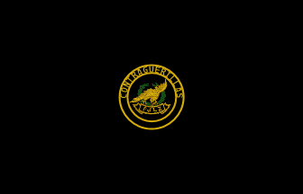 Image is based on pictures taken during the demobilization ceremony of the Autodefensas Campesinas del Magdalena Medio (ACMM) or Peasant Self-Defense of Middle Magdalena. They are called like that because they are located mainly along the stream of the Magdalena River, operating basically on the borders of the Departments of Antioqiua, Boyacá and Santander. The ACMM comprises six fractions (fronts) and the flag shown is the flag of the founding front, the Frente José Luis Zuluaga (José Luis Zuluaga Front). The ACMM belong to the AUC, the confederation of paramilitary groups in Colombia. The flag is on black background charged with the Coat of Arms.
