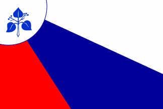 The SSk uses its flag only very infrequently; it can be seen on pages 10 and 13 of the photo gallery at athttp://www.slovenskaskupnost.org/Galerija.aspx. The flag has a white disc thinly bordered blue in the upper fly with the blue lime sprig from its logo, but no red circle or inscriptions. From this disc there radiate three rays in the colors of the Slovene national flag.