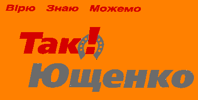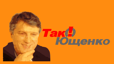 Electoral bloc of Victor Yushchenko (opposition) uses the orange flags with a red word "Tak!" (Yes!), grey horseshoe and red motto "Viryu Znayu Mozhemo" (I beliewe, I know, We can).