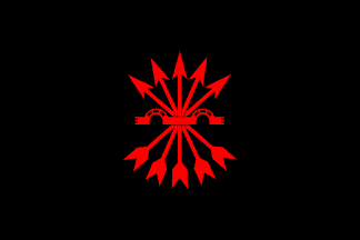 Venezuelan Phalanx /(Falange Venezolana)/ is a minor political movement which is modelled after the Spanish Phalanx. Its current flag differs from that of the model movement in an all-black field, which they claim that is a common feature of all Latin American Phalangist movements; the red color of yoke and arrows was kept unchanged [1]. The earliest appearance of this design on the Web was in February 2002 [2], so it was probably introduced not long before that. The previous flag had employed only the colors of the Spanish Phalangist flag, having been charged with a large red arrow cross on black field. The image of this pattern did appear side by side with that of the national flag (pre-Chavez variant) on the old website [3], but it is not distinguishable from the black page background, so its use as a flag is to be confirmed indirectly, by its use at the site of The Phalanx /(La Falange)/, a minor Phalangist party ffrom Spain, where it appeared along with the flags of other Latin American Phalangist movements [4]. Along with its own flag, the Venezuelan Phalanx also uses the Cross of Burgundy flag as the symbol of Hispanity /(Hispanidad)/ [1].