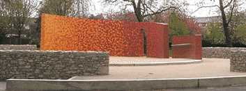 Sculptured bandstand/stage/walk-through sculpture is in Stratford Park. The tiled backing wall centrepiece stands within a large circular area with low walls. (See No. 32. on the MAP )