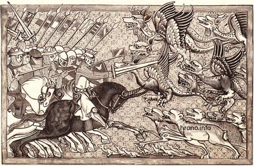 Сцена из военных походов Александра Великого. Фантастическое изображение из манускрипта XIII столетия, хранящегося в Брюссельской библиотеке.