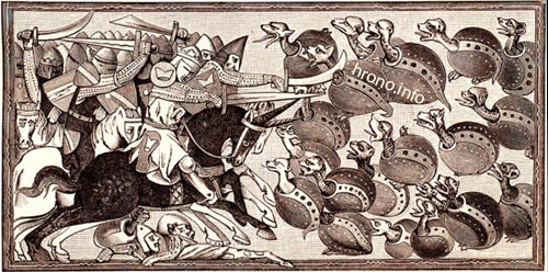 Александр Великий и его свита сражаются с черепахами. Фантастическое изображение из манускрипта XIII столетия, хранящегося в Брюссельской библиотеке.