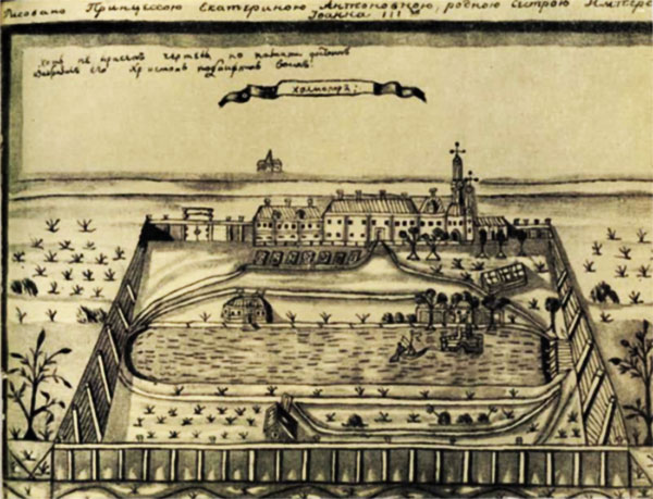 Заключению Иоанна в Шлиссельбург предшествовало двенадцатилетнее его заточение совершенно секретно в особом здании в Холмогорах, где отдельно от него, тогда еще маленького ребенка, содержались его отец, мать, братья и сестры. Одна из этих сестер зарисовала обнесенную высоким забором с воротами, запертыми железными замками, усадьбу, в которой 36 лет (1744— 1780 гг.) безвыходно содержались узники. Рисунок (рис. 13) хранится в Академии наук, но был воспроизведен в 1873 году в печати. Он сделан неискусной рукой, но, по словам Брикнера, передает зрителю «уединение, уныние, монотонию и скуку» 1. Отсюда Иоанн был вывезен ночью с соблюдением строжайшей тайны и доставлен в Шлиссельбургскую крепость под названием «безымянного колодника». Об условиях его содержания в Шлиссельбургской крепости до нас дошли некоторые сведения.
