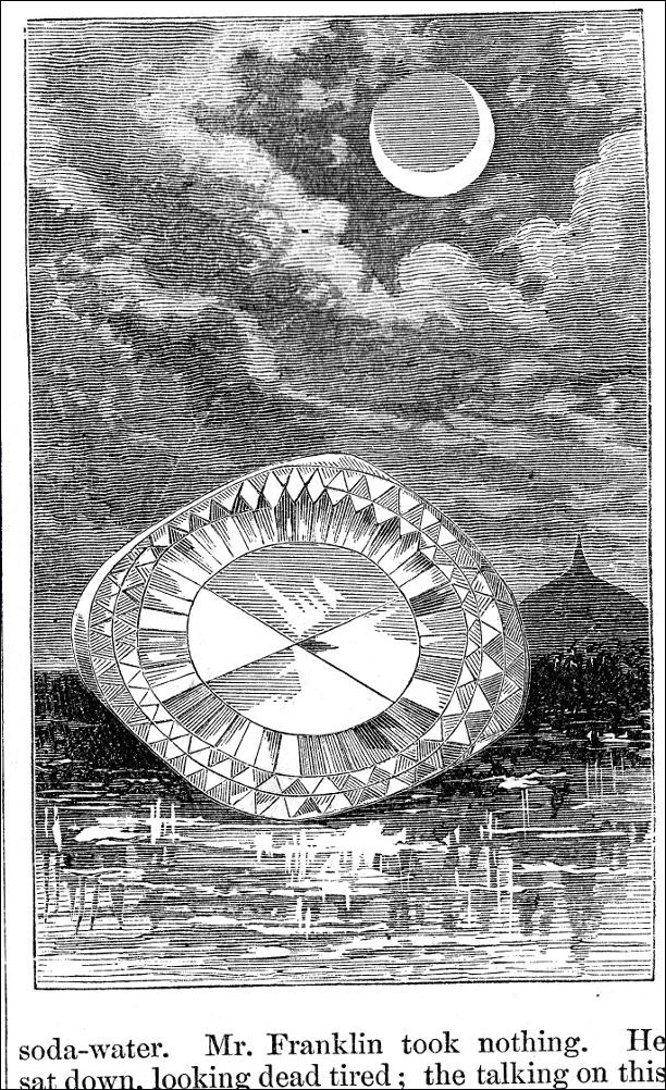 Lord bless us! it was a Diamond! As large, or nearly, as a plover's egg! The light that streamed from it was like the light of the harvest moon. When you looked down into the stone, you looked into a yellow deep that drew your eyes into it so that they saw nothing else. It seemed unfathomable; this jewel, that you could hold between your finger and thumb, seemed unfathomable as the heavens themselves. We set it in the sun, and then shut the light out of the room, and it shone awfully out of the depths of its own brightness, with a moony gleam, in the dark. — "First Period: The Loss of the Diamond (1848), The Events related by Gabriel Betteredge, house-steward in the service of Julia, Lady Verinder," Harper's Weekly, 25 January 1868, Chapter 9, p. 55.