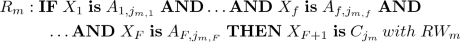 where \(j_{m,f} \in [1, T_f]\), \(f=1,...,F+1\), identifies the index of the fuzzy set (among the \(T_f\) linguistic terms of partition \(P_f\)), which has been selected for \(X_f\) in rule \(R_m\).