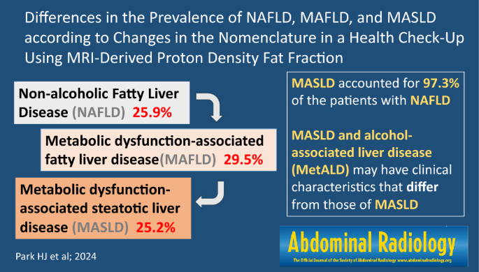 Park, H.J., Lee, S. & Lee, J.S. Differences in the prevalence of NAFLD, MAFLD, and MASLD according to changes in the nomenclature in a health check-up using MRI-derived proton density fat fraction.Abdom Radiol 49, 3036–3044 (2024). https://doi.org/10.1007/s00261-024-04285-w