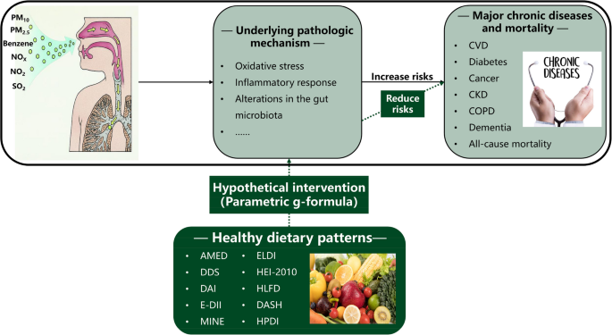 .")\]. The prevalence of chronic diseases and the resulting premature death inevitably contribute to substantial disease and financial burdens \[[2](/article/10.1186/s12916-025-04489-x#ref-CR2 "Zhu K, Li R, Yao P, Yu H, Pan A, Manson JE, et al. Proteomic signatures of healthy dietary patterns are associated with lower risks of major chronic diseases and mortality. Nat Food. 2024;6(1):47–57."), [3](/article/10.1186/s12916-025-04489-x#ref-CR3 "GBD Europe Life Expectancy Collaborators. Changing life expectancy in European countries 1990–2021: a subanalysis of causes and risk factors from the Global Burden of Disease Study 2021. Lancet Public Health. 2025;10(3):e172–88.")\]. Research evidence indicates that ambient air pollution adversely influences chronic diseases and mortality risk \[[4](#ref-CR4 "Liu S, Zhang Y, Ma R, Liu X, Liang J, Lin H, et al. Long-term exposure to ozone and cardiovascular mortality in a large Chinese cohort. Environ Int. 2022;165:107280."),[5](#ref-CR5 "Lin H, Liu T, Xiao J, Zeng W, Li X, Guo L, et al. Mortality burden of ambient fine particulate air pollution in six Chinese cities: results from the Pearl River Delta study. Environ Int. 2016;96:91–7."),[6](#ref-CR6 "Chen G, Qian ZM, Zhang J, Wang X, Zhang Z, Cai M, et al. Associations between changes in exposure to air pollutants due to relocation and the incidence of 14 major disease categories and all-cause mortality: a natural experiment study. Environ Health Perspect. 2024;132(9):97012."),[7](/article/10.1186/s12916-025-04489-x#ref-CR7 "Xia X, Meng X, Liu C, Guo Y, Li X, Niu Y, et al. Associations of long-term nitrogen dioxide exposure with a wide spectrum of diseases: a prospective cohort study of 0.5 million Chinese adults. Lancet Public Health. 2024;9(12):e1047–58.")\]. In 2021, air pollution accounted for 8.1 million deaths globally (approximately 5.7 million attributable to chronic diseases), making it the second leading risk factor for death \[[8](/article/10.1186/s12916-025-04489-x#ref-CR8 "GBD. Global incidence, prevalence, years lived with disability (YLDs), disability-adjusted life-years (DALYs), and healthy life expectancy (HALE) for 371 diseases and injuries in 204 countries and territories and 811 subnational locations, 1990–2021: a systematic analysis for the Global Burden of Disease Study 2021. Lancet. 2024;403(10440):2133–61.")\].The underlying pathologic mechanism is the increase in oxidative stress and the inflammatory response [9] and alterations in gut microbiota [10]. In contrast, healthy dietary patterns, such as the alternate Mediterranean diet (AMED) [11], alternate healthy eating index-2010 (AHEI-2010) [12], Dietary Approaches to Stop Hypertension (DASH) [13], Mediterranean-Dietary Approaches to Stop Hypertension Diet Intervention for Neurodegenerative Delay (MIND) [14], healthy plant-based diet index (HPDI) [15], EAT-Lancet diet index (ELDI) [16], dietary diversity score (DDS) [17], dietary antioxidative index (DAI) [18], energy-adjusted dietary inflammatory index (E-DII) [19], healthy low-fat diet (HLFD) [20], and healthy low-carbohydrate diet (HLCD) [21], could reduce oxidative stress and inflammation [22], and optimize the microbial community structure [23]. Although previous observational studies have investigated the modifying effect of dietary patterns on air pollution-related chronic diseases [24,25,26,27,28,29], few studies have focused on air pollutant mixtures. In the real world, individuals are constantly exposed to a complex mixture of air pollutants, and research on this topic is highly important to public health. Moreover, no randomized trial has quantified the causal modifying effect of dietary pattern interventions on associations between air pollution and chronic diseases, in part because of the inherent challenges in conducting a large-scale, sustained, long-term dietary intervention.