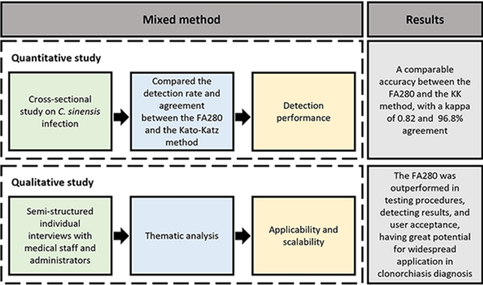 Therefore, our study employed a mixed-method study integrating both quantitative and qualitative approaches. Using the KK method as the reference and focusing on a community-based population, we assessed the performance, applicability, and scalability of the FA280 in diagnosing clonorchiasis, thus comprehensively exploring its application value in the future.