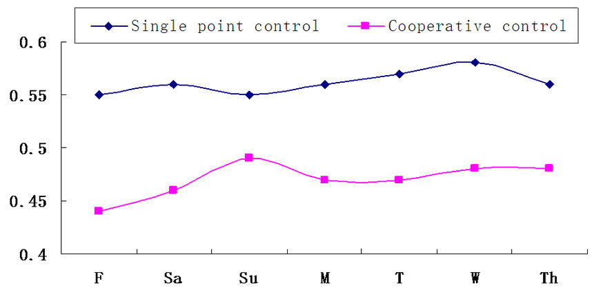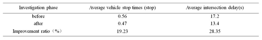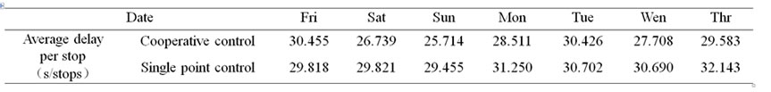 Figure 3 and [Table 2](#Table 2) show: not only intersection average delay, but also average vehicle stop times has reduced when under cooperative control status comparing with single point control status. Average delay per stop at intersections in Wuhan is in the range of 25.714s ~ 32.143s .According to the data displayed from the two working status, the improvements of total delay and total stops of the network under cooperative control are 28.35% and 19.23% separately. Average delay per stop at intersections of the whole system under cooperative control has more obvious improvements in weekdays with relatively less traffic which reduces about 3s/stop compared with the single point control working status while the improvements in non-working days with heavy traffic is less obvious. This improvement is quite significant to the whole system. After the implementation of Area Traffic Control system in Wuhan, the economic benefits due to reduction in travel time and flue consumption is proximately up to 2.08 billion yuan per year. At the same time, we can reduce about 67454.2 kg per year vehicle exhaust emissions which including NOx, CO and CH. The facts show that cooperative control system can reduce delay and vehicle stop times at intersections, also bring the traffic system enormous traffic benefits.