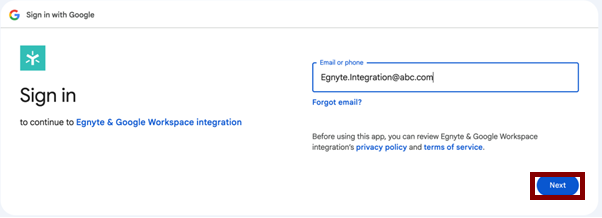 - Sign in with the email address associated with a service account. Click Next in the Google Authorization pop-up.