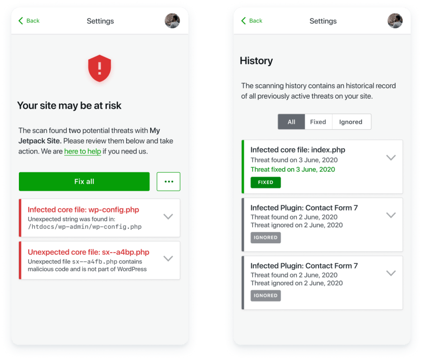 Jetpack scans for known exploits of WordPress, and WordPress plugins and themes. If there’s a newer version of a theme or plugin that has patched a threat, you can update them with one click. If there isn’t a newer version with a fix, we can help you to delete these from your site.