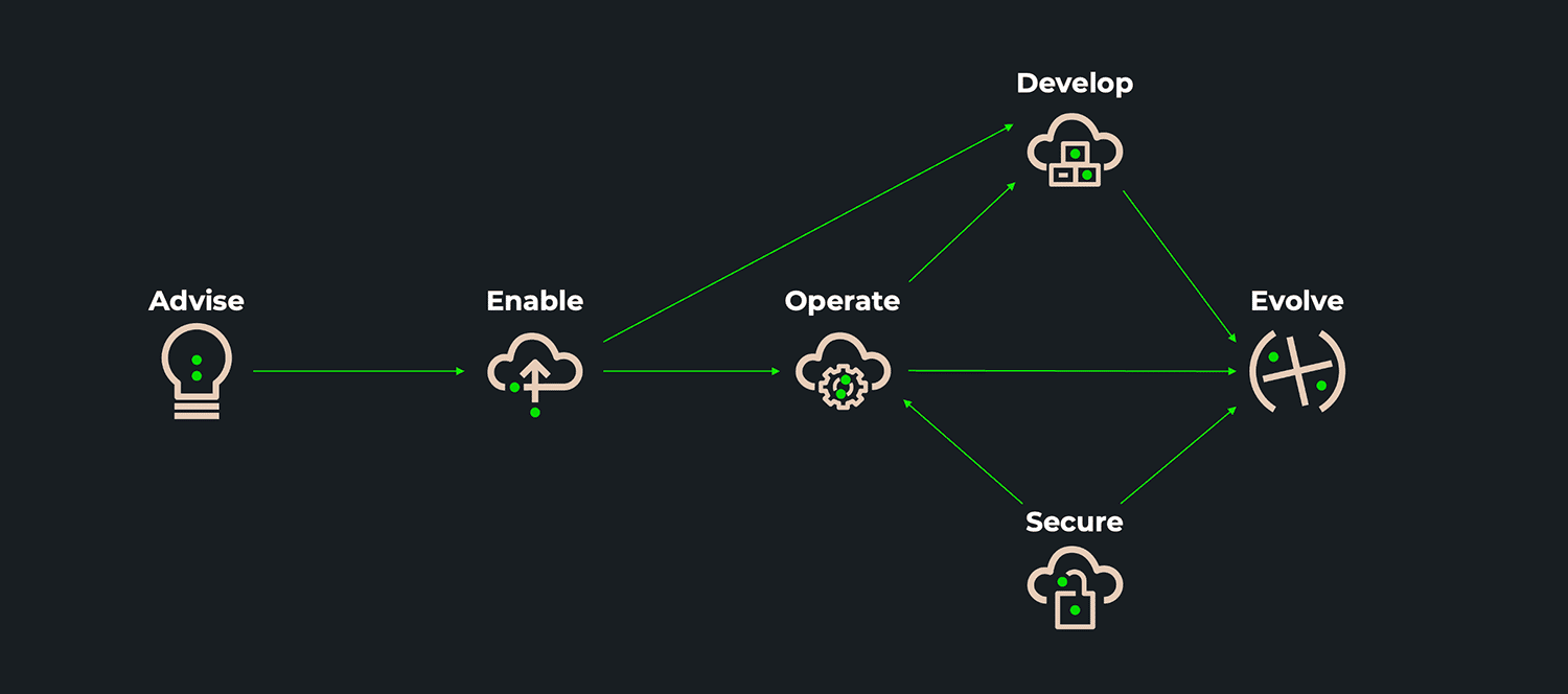 We offer six key categories of cloud services to truly enable you to co-innovate and accelerate your cloud adoption. With Advise, Enable, Operate, Secure, Develop and Evolve you can cover the end-to-end lifecycle of your Cloud and stay in control.
