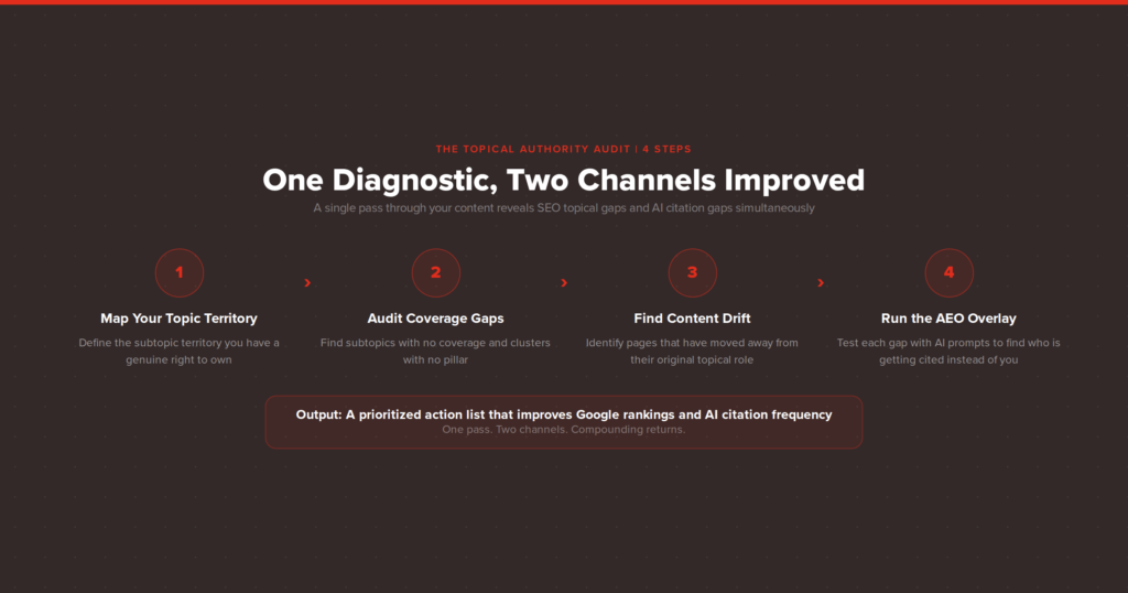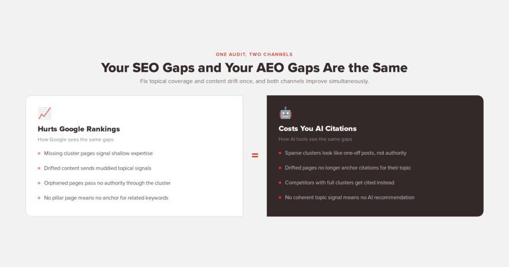 What makes a topical authority audit worth doing right now, beyond the traditional SEO argument, is that the same audit reveals exactly where you stand on AI citation readiness. The gaps that prevent Google from treating you as a topical authority are the same gaps that prevent ChatGPT and Perplexity from citing you when someone asks a question in your category. One diagnostic, two channels improved.