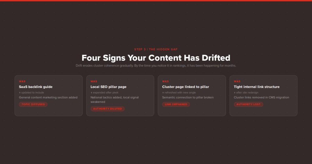 To audit for drift manually, pull the original intent of each major page in your cluster (what topic was it clearly optimized for when first published?) and compare it to what the page actually covers today. Where there is significant divergence, drift has occurred.